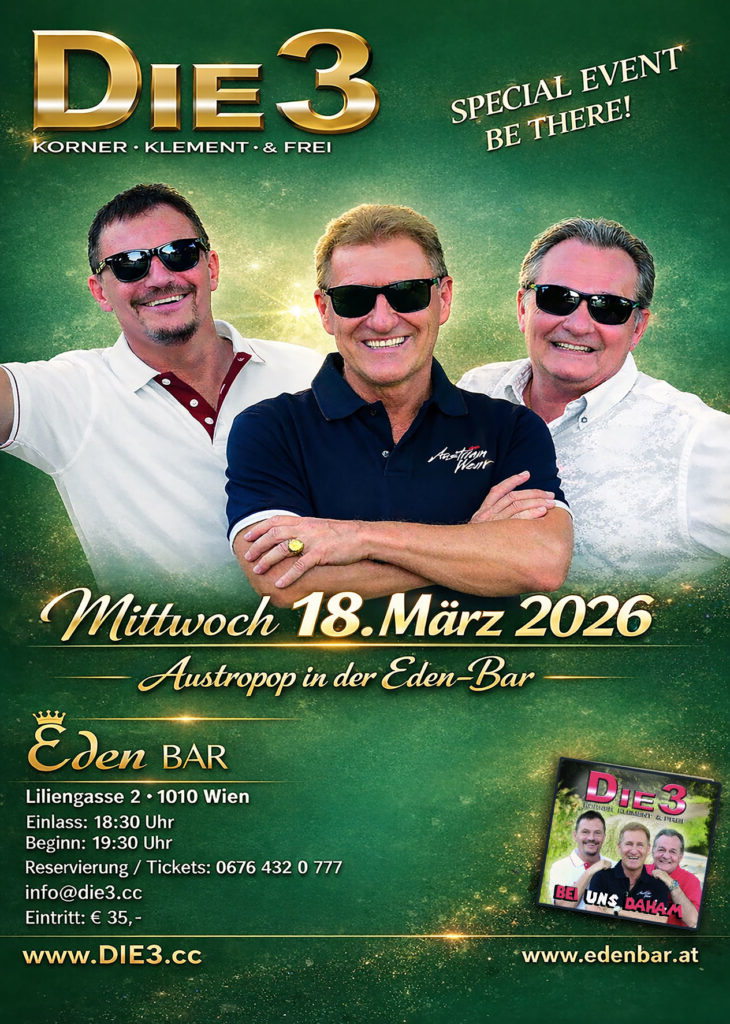 sind DIE3 aus der österreichischen Musikszene nicht mehr wegzudenken. Sie lassen bekannte Songs von AUSTRIA 3 weiterleben und begeistern seither mit legendären Austropoptiteln wie u. a. „Weus’d a Herz hast wia a Bergwerk“, „Zentralfriedhof“, „Macho Macho“, „Ruf mi net an“, ihr Publikum.